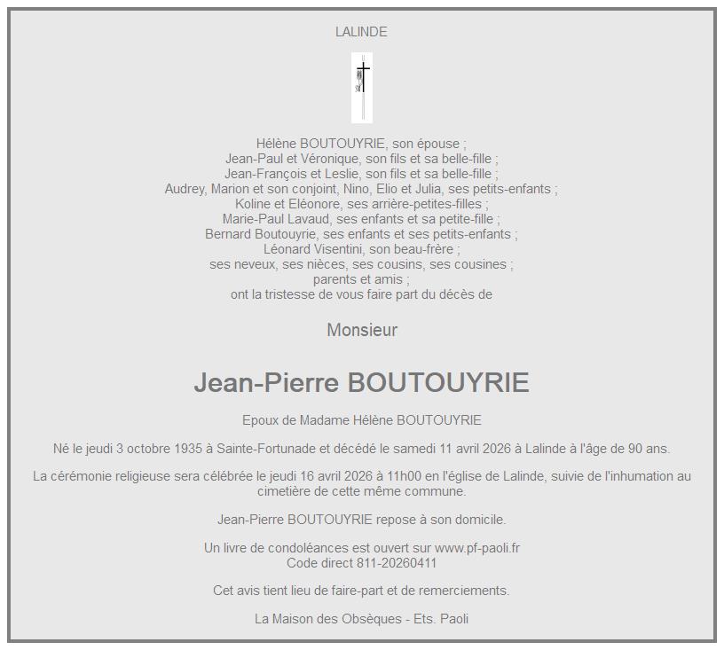 Avis de décès de Monsieur Jean-Pierre BOUTOUYRIE
