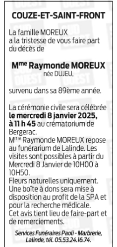 Décédée à Couze-et-Saint-Front (24150, France) le mercredi 1 janvier 2025 à l'âge de 88 ans