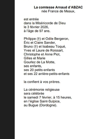 Décédée à Le Bugue (24260, France) le mardi 3 février 2026 à l'âge de 97 ans