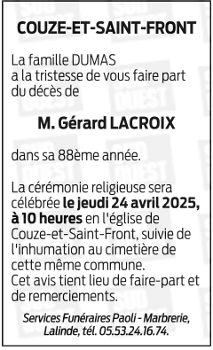 Né à Couze-et-Saint-Front (24150, France) le mercredi 28 juillet 1937